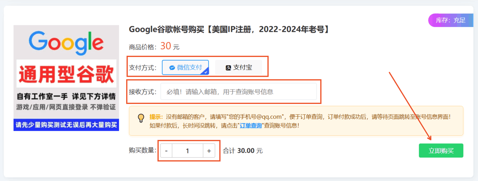 2、在购买页面,选择支付方式(微信、支付宝),填写邮箱,选择购买数量,点击“立即购买”。